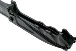 La apertura y el cierre de la hoja se realizan con las dos manos juntas para minimizar el riesgo de autolesiones. El mecanismo de seguridad adicional es un perno de acero que se atornilla a mano a través de dos orificios situados en la zona de protección del mango macizo de aleación de aluminio anticorodal. Este mecanismo es necesario debido a la actuación violenta de corte que presenta esta navaja poco común. La funda es una parte indispensable del conjunto. Contiene un afilador de diamante y permite al usuario llevar la navaja en forma desplegada (sujeta por un encaje de dos clips) o en forma plegada (dentro del bolsillo delantero). La funda se puede colgar en una chaqueta de combate o a los cinturones estándar gracias al M.O.L.L.E. sistema militar.