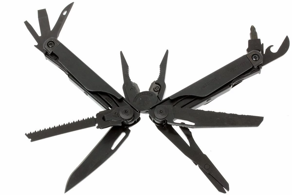 La Leatherman Surge es una multiherramienta de gran tamaño para uso profesional. Se ve enseguida que es la hermana mayor de la popular Leatherman Wave. Herramientas similares, pero un 15% más grandes. La Surge está construida de tal manera que algunas piezas son reemplazables. Muy sostenible cuando se utiliza la herramienta con frecuencia.
